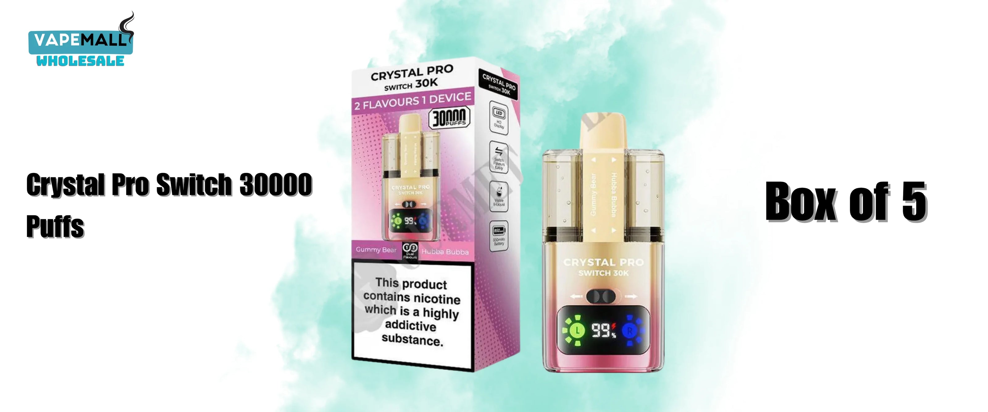 Join a thriving community of wholesale customers and merchants who prefer to frequent the Vape Mall Wholesale to deliver quality supply and exclusive goods like the Crystal Pro Switch 30K Box of 5. Get an exceptional taste delivery, pleasant vapor congruency and consistent performance in every device.